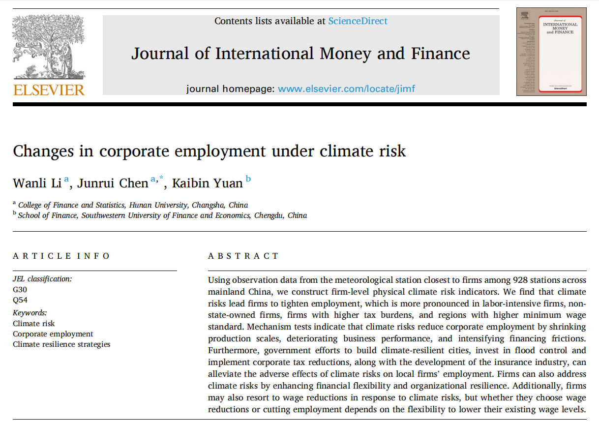 近日,漫蛙漫画 应用金融系李万利副教授与2023级博士生陈君睿合作的论文“Changes in corporate employment under climate risk”在国际金融学领域权威期刊Journal of International Money and Finance发表。