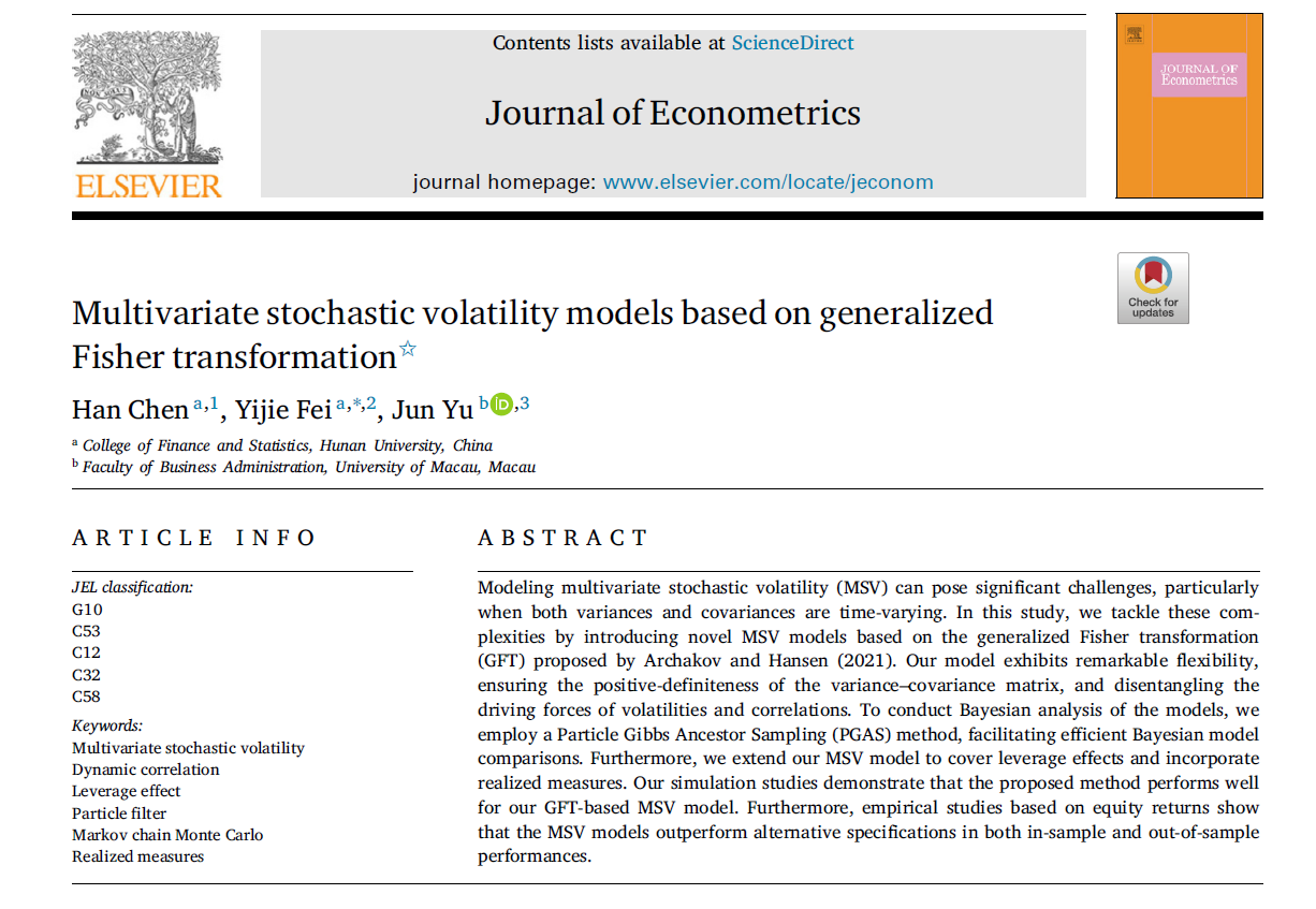 近日,漫蛙漫画 陈汉助理教授、费毅捷助理教授与澳门大学余俊教授合作完成的学术论文“Multivariate stochastic volatility models based on generalized Fisher transformation”在计量经济学国际顶尖期刊Journal of Econometrics在线发表。漫蛙漫画 陈汉助理教授为该文第一作者,费毅捷助理教授为该文通讯作者。