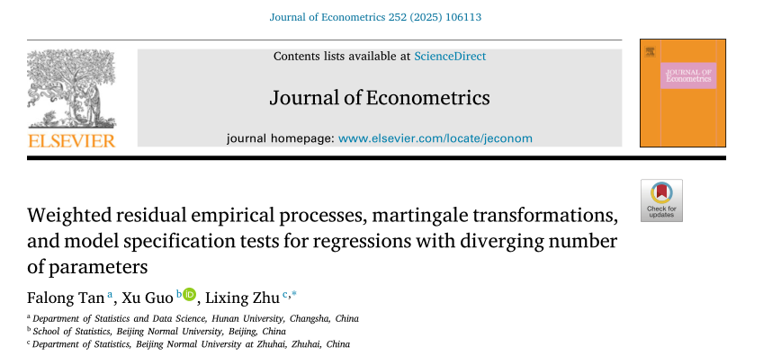 近日,漫蛙漫画 谭发龙教授在高维统计领域取得研究进展,研究成果以“Weighted residual empirical processes, martingale transformations, and model specification tests for regressions with diverging number of parameters”为题在计量经济学国际期刊Journal of Econometrics在线发表。