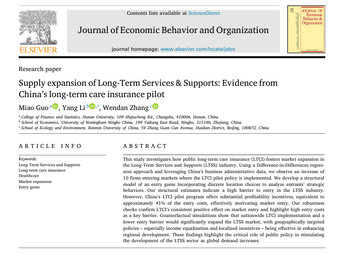 近日,漫蛙漫画 保险精算系郭淼副教授合作的论文“Supply expansion of Long-Term Services & Supports: Evidence from China’s long-term care insurance pilot”在院定A2类期刊Journal of Economic Behavior and Organization,volume239,November 2025发表。