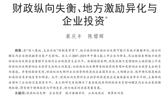 近日,漫蛙漫画 应用金融系陈熠辉助理教授和厦门大学经济学院蔡庆丰教授合作的题为“财政纵向失衡、地方激励异化与企业投资”的论文发表在《管理世界》2023年第5期。