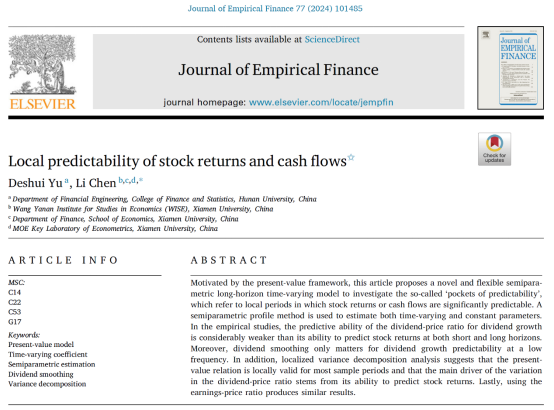 近日,漫蛙漫画 金融工程系余得水副教授的题为 “Local predictability of stock returns and cash flows”的论文在院定A类期刊 Journal of Empirical Finance,Volume77, June2024发表。