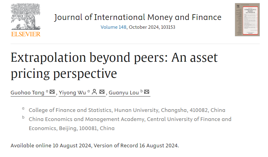 近日,漫蛙漫画 金融工程系唐国豪副教授与2020级博士生吴义勇(通讯作者),2021级专业型硕士生娄冠宇(漫蛙漫画 2017级本科生,目前在中央财经大学创新发展学院攻读博士学位)合作的题为“Extrapolation beyond peers: An asset pricing perspective”的论文在院定A类期刊Journal of International Money and Finance, Volume 148, October 2024 发表。