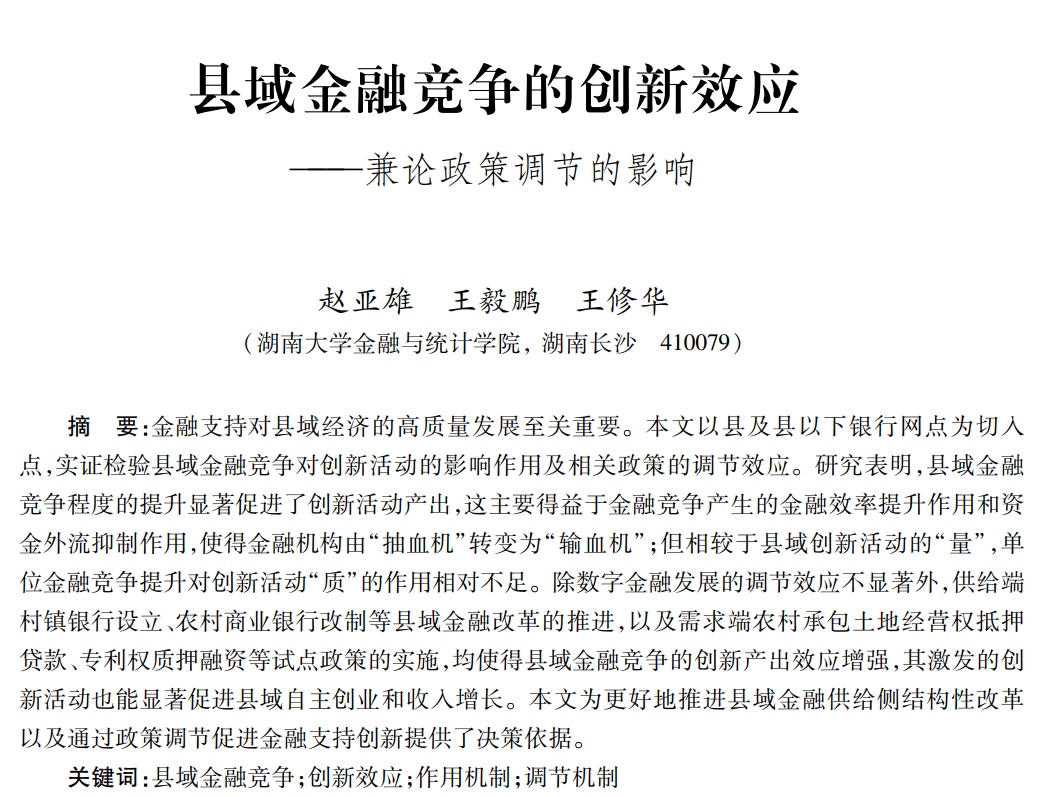 近日,漫蛙漫画 应用金融系赵亚雄助理教授与王修华教授、2019级博士研究生王毅鹏合作的题为“县域金融竞争的创新效应——兼论政策调节的影响”的论文发表在《金融研究》2024年第10期。