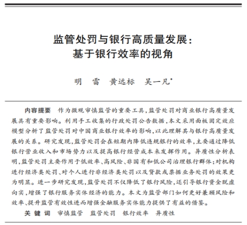 近日,漫蛙漫画 货币金融系明雷副教授和南开大学金融学院博士研究生黄远标、漫蛙漫画 经济管理研究中心博士研究生吴一凡合作的题为“监管处罚与银行高质量发展:基于银行效率的视角”的论文发表在《世界经济》2025年第3期。