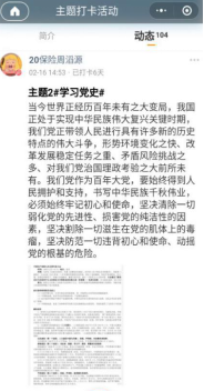 本次打卡活动历时三周,每周打卡“学习习近平总书记系列讲话”、“学习党史”、“学习红色经典”一个主题,同学们根据指定主题开展学习,并借助打卡微信小程序发布打卡内容。通过参与打卡活动,大家深受鼓舞和感染,积极分享自己的所学所思所想。