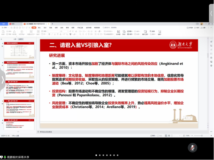 讲座伊始,戴鹏毅就其课题研究过程,以我国资本市场的制度变迁史为开端,抛出“请君入瓮还是引狼入室?”的趣味性问题来针对主题研究进展向观众进行矛盾性分析,最后基于背景总结出的三个问题引出了本次活动介绍的研究主题。关于所研究问题,戴鹏毅依托一个“开放”、三个“机制”概括了主题中的影响作用路径,而后重点向观众分享了其在实证研究中的步骤及思考,阐述了其在进行研究过程中的逻辑设计,为研究生提供了相关论文写作的经验。