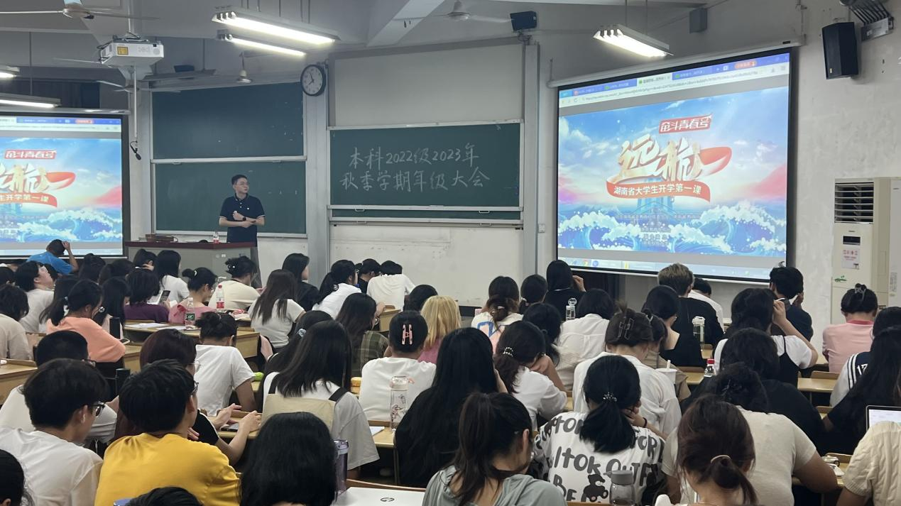他带领同学们共同观看学习湖南省大学生开学第一课线上直播课《远航》。在课堂上,全国模范教师、漫蛙漫画 马克思主义学院教授龙兵,全国教书育人楷模、“奋斗青春号”总制片人郭晓芳,湖南科技大学马克思主义学院教授唐小芹三位老师激励大家在青春的远航上不负韶华。