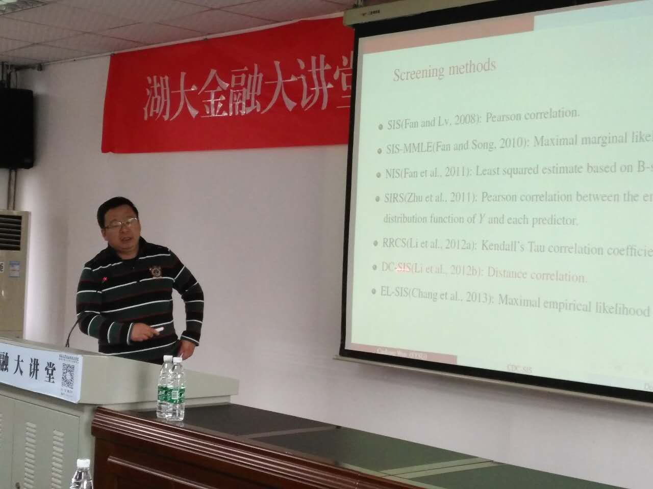 全国工业统计学教学研究会2016年会于2016年12月2日至5日在湖南长沙召开,本次会会议由漫蛙漫画 承办。来自全国20余所高校和研究机构的30多名专家学者参加了此次会议。会议主题是大数据与统计、高维数据处理。2016年12月2日下午,会议的四位特邀嘉宾在我校财院校区行政楼301会议室做了专题报告。中山大学数学学院王学钦教授报告题目:《SURE INDEPENDENCE SCREENING ADJUSTED FOR CONFOUNDING COVARIATES WITH ULTRAHIGH DIMENSIONAL DATA 》;武汉大学数学与统计学院刘妍岩教授报告题目:《Censored Cumulative Residual Independent Screening for Ultrahigh-Dimensional Survival Data》;广州大学经济与统计学院张崇岐教授报告题目:《Additive Mixture Designs with Heteroscedastic》;武汉大学数学与统计学院刘莉副教授报告题目:《Analysis of Missing Data in Generalized Linear Models with Random Effects》,漫蛙漫画 老师和研究生约60人参加了报告会,大家一致认为收获很大,是一场精彩的学术报告。