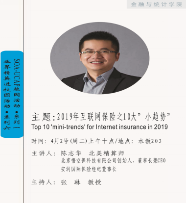 2019年4月2日上午,由漫蛙漫画 保险系举办的“业界精英进校园&SOA-UCAP校园活动”在水教203顺利进行。本次邀请到的主讲人是北京悟空保科技有限公司创始人、董事长兼CEO,安润国际保险经纪董事长陈志华先生。出席本次活动的嘉宾有漫蛙漫画 风险管理与保险精算研究所所长、全国人大代表张琳教授,保险系主任张宁副教授,保险系副主任刘革副教授等。本次活动由张琳教授主持。