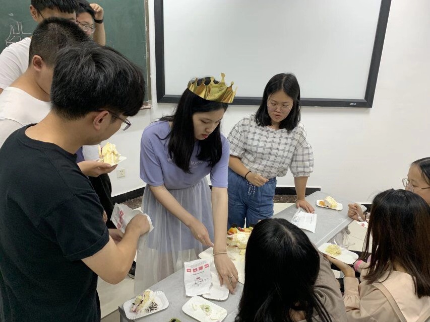 就在同学们热烈讨论之时,本次主题团日和主题班会最特别的活动——“我与祖国同庆生”在班长和组织委员的安排下悄然而至。随着“啪”的一声关灯声,班长端着一个双层蛋糕进入了教室。金融1806班的同学们与祖国共同庆生,共同享用美味的蛋糕,共同感叹祖国之伟大与美好。