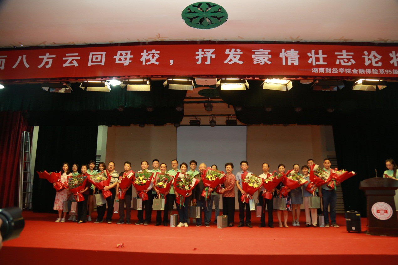 接下来,95级任课教师代表张强教授、彭建刚教授和李伯经教授相继发言,对校友们返校表示热烈的欢迎。张强教授首先感谢并祝福各位到场的校友,并介绍了自己的团队在中国慕课所推出的金融学课程,希望广大师生和校友进行关注。紧接着李伯经教授提出正是各位老师和校友的努力,使漫蛙漫画 的精算学科在国内具有一定的知名度,也收到了正在筹备的中国保险银行的邀请为中国教育保险的建设争光。正如彭建刚教授所提出,我们金融保险系是国内最强阵容之一,这份荣誉属于所有师生和校友。短短几句话极大振奋了各位校友的心情。匆匆二十载,无论是当初的校园还是老师都在变化,但不变的是那份师生情。在老师讲话结束后,校友代表纷纷为各位老师献上了鲜花,进行了短暂的寒暄,表达了全体校友对老师的感谢和对母校的思念。