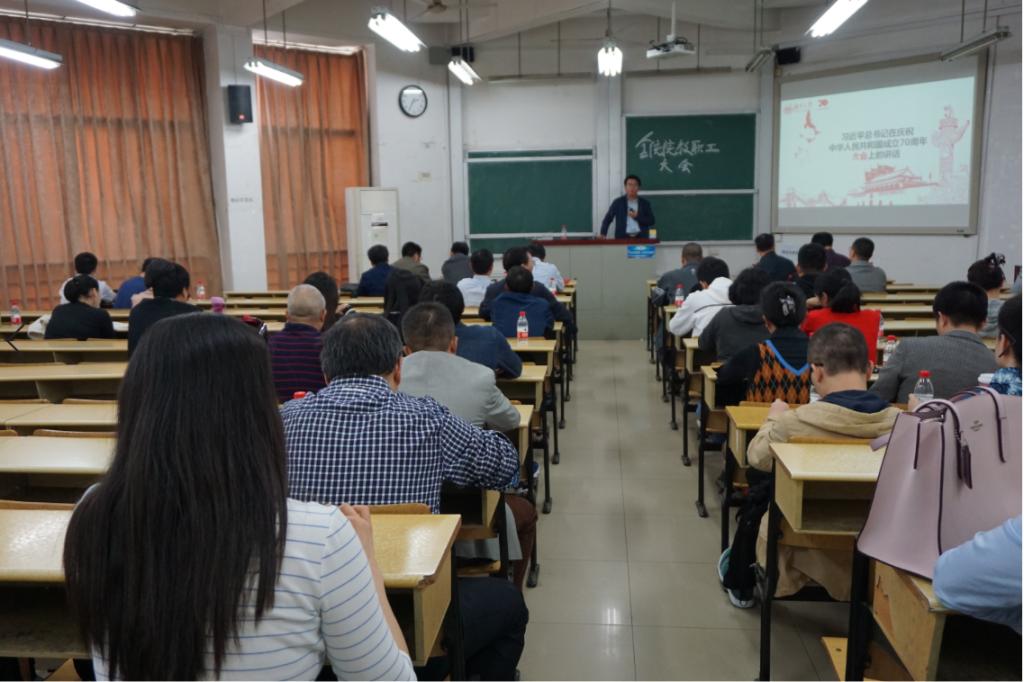 在读原著学原文过程中聂书记从“三个关键词”、“五个坚持”、“三个时间坐标”、“三个万岁”四个方面解读习近平总书记在新中国成立70周年大会上讲话的精神内涵;并同与会人员分享新中国成立70周年伟大成就;带领学院领导班子及全体教职工重温习近平总书记谈“爱国”十段经典话语;最后,通过“中国特色社会主义符合人类社会的发展规律,开辟了科学社会主义发展的新境界;以人民为中心,创造性地满足人民对美好生活的需要”等五个方面阐述“中国特色社会主义为什么好”这一重点议题。专题会上与会人员仔细聆听、认真记录、积极思考。