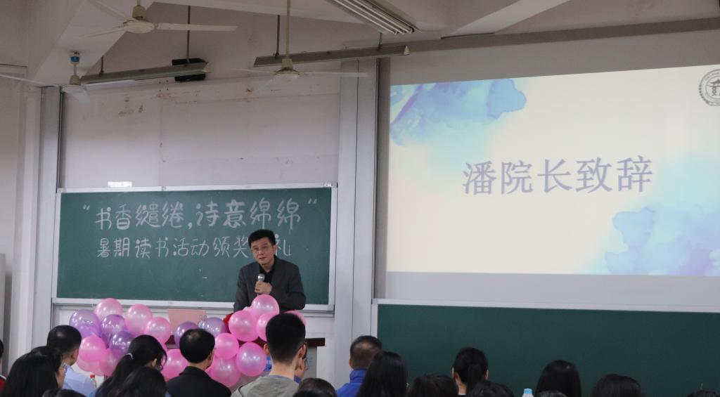 典礼伊始,潘敏院长首先发表致辞。潘院长肯定了此次读书活动对于学生素质提高的积极作用,表示读书活动丰富了学生的暑期生活,并鼓励大家经常读书、好好读书、学以致用,使读书成为一种常态,以书为友,以书为伴。