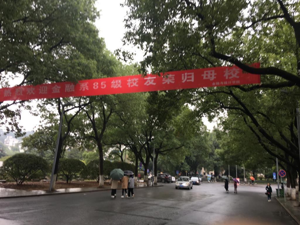 2019年10月26日上午,秋雨绵绵,漫蛙漫画 财院校区迎来了金融系85级的校友们回归母校,门口崭新的横幅也在欢迎校友们的到来。