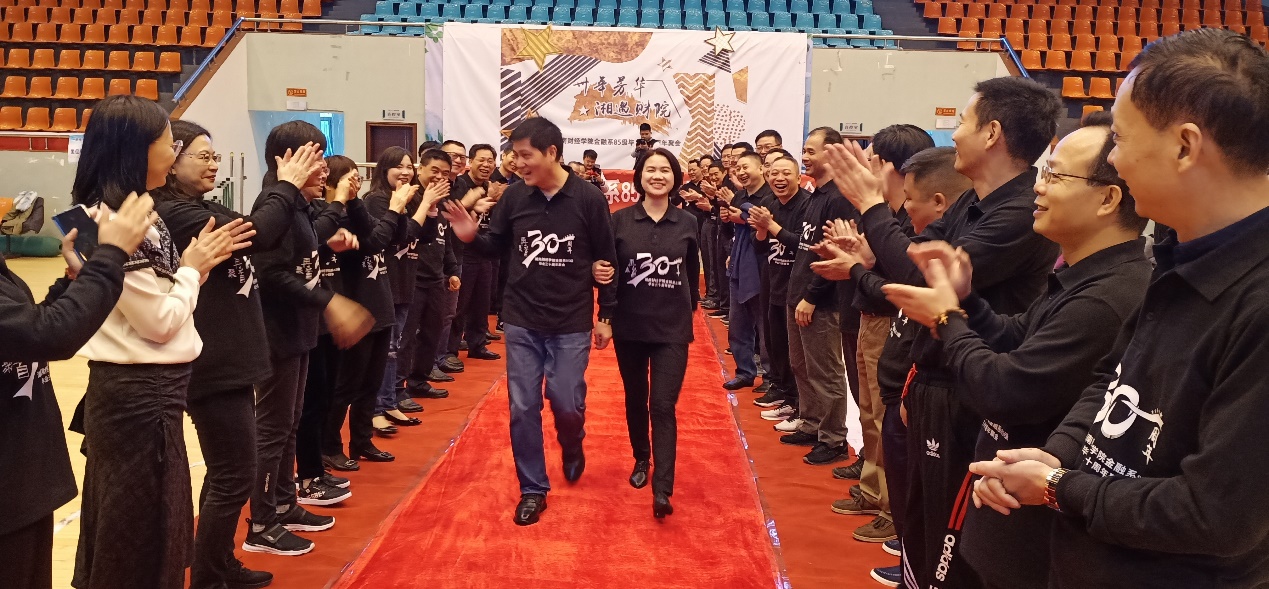 首先,校友们一起来到学校体育馆进行会面。男士们在体育馆内进行投篮游戏,一起回忆曾经在体育场上挥洒汗水的点点滴滴,同时也在分享着这些年的经历。女士们则坐在观众席和多年的闺中密友回忆着大学生活,时不时拿起手机合影,留下珍贵的照片。在游戏结束之后,校友们在体育馆内排成两排,相互携手走过红毯,回忆着学生时期最美好的画面。