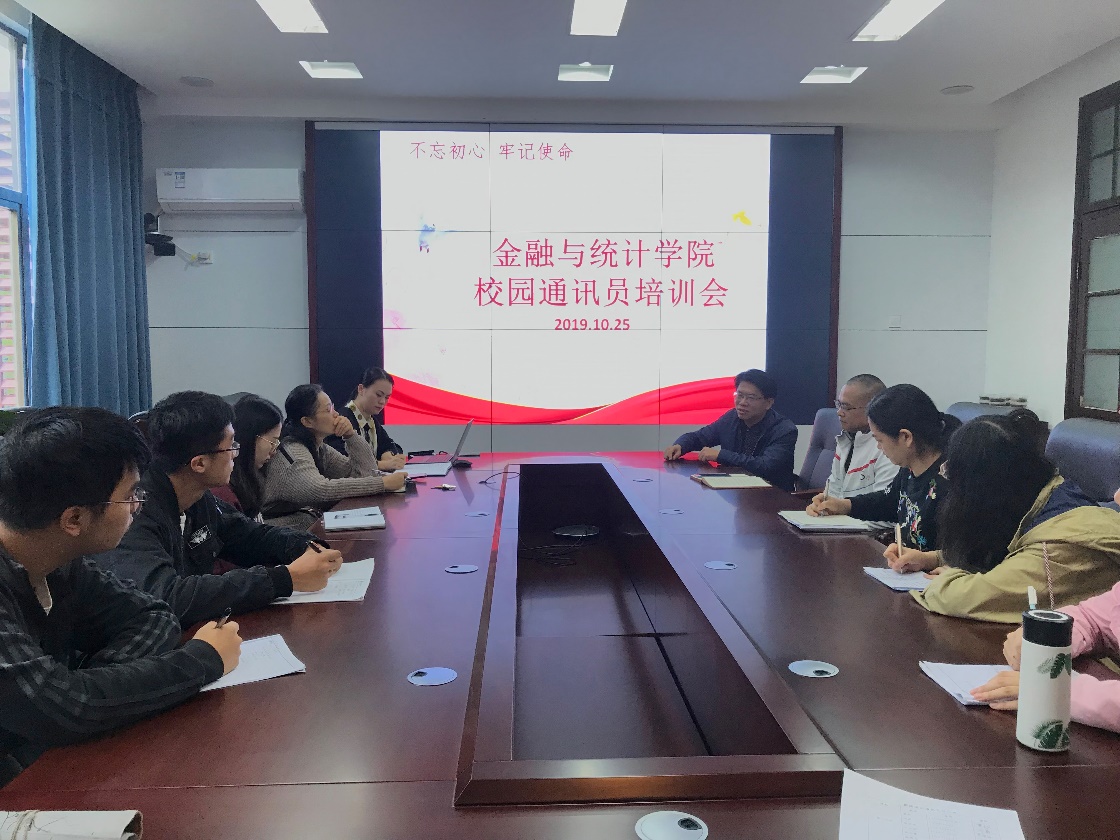 聂国军书记在会上发表了指导讲话,聂书记表示参与会议的同学都是学院的优秀学生,并对同学们的到来表示感谢。聂书记指出在学校全体师生为“双一流”建设而奋斗的大环境下,金统院更要为“双一流”建设不懈努力,组建一支学院宣传队伍十分重要。聂书记强调,榜样的力量是无穷的,榜样就在身边。宣传队伍应该牢牢掌握宣传工作的主导权,突出主旋律和正能量,把身边的先进人物和先进事迹挖掘出来。树立和发扬先进典型的作用,精心打造好“忠诚担当、协调高效”的学院文化。
