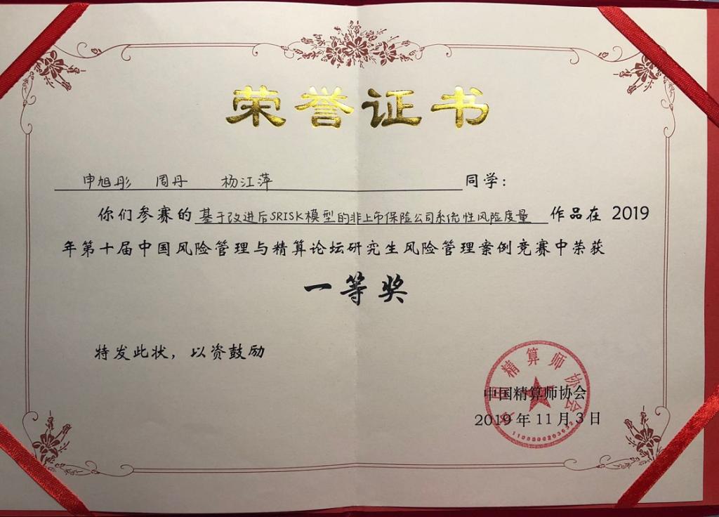 11月2日下午来自国内外高校的近200名学生,共60支团队分别在本科生及研究生竞赛专场做了展示。本科生竞赛以保险产品创新为主题,研究生竞赛以风险管理方案为主题,由来自行业内的数十名资深精算师和知名高校教授担任评委。在研究生风险管理竞赛环节,由张琳教授指导,申旭彤、周丹、杨江萍为代表参赛的作品《基于改进后SRISK模型的非上市保险公司系统性风险度量》荣获研究生组一等奖。