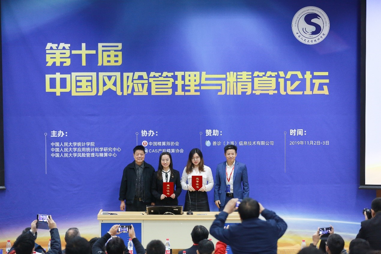 11月3日上午,新加坡南洋理工大学商学院银行与金融系教授王树勋(Shaun Wang)、北京大学数学科学学院教授杨静平、加拿大滑铁卢大学统计与精算学系教授陈建成(Ken Seng Tan)等多名国内外著名风险管理与精算专家在主会场分享了其最新的研究成果。之后,进行颁奖仪式。仪式由参会嘉宾为获奖队伍颁奖,周丹代表团队上台领奖。