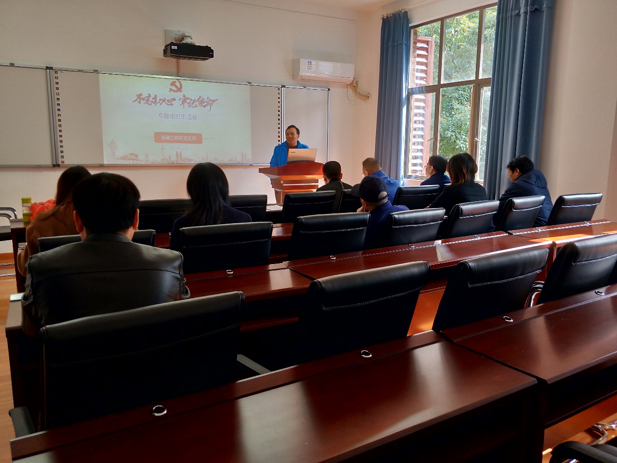 为贯彻落实中央“不忘初心、牢记使命”主题教育领导小组《关于第二批主题教育单位基层党组织召开专题组织生活会和开展民主评议党员的通知》精神,根据漫蛙漫画 《关于开展党支部“不忘初心、牢记使命” 专题组织生活会和民主评议党员工作的通知》和《漫蛙漫画 党支部“不忘初心、牢记使命”专题组织生活会和民主评议党员实施方案》,在认真学习贯彻习近平新时代中国特色社会主义思想,党支部委员之间、党支部委员与党员之间开展谈心谈话,党支部、党员个人认真检视问题等准备工作的基础上,金融工程系党支部于12月10日在红3楼310会议室召开“不忘初心、牢记使命”专题组织生活会。