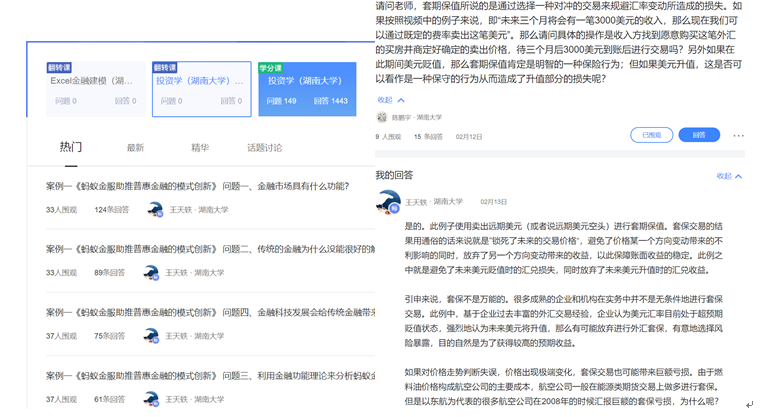 学生们以极高的热情参与着线上互动问答:截至2020年2月22日,投资学慕课平台的师生发起问题149个,累计回答1443条,平均每个问题有10条回答,最热的问题有124条回答。任课老师每天都在平台上认真阅读同学们提出的问题,并进行耐心细致的解答。