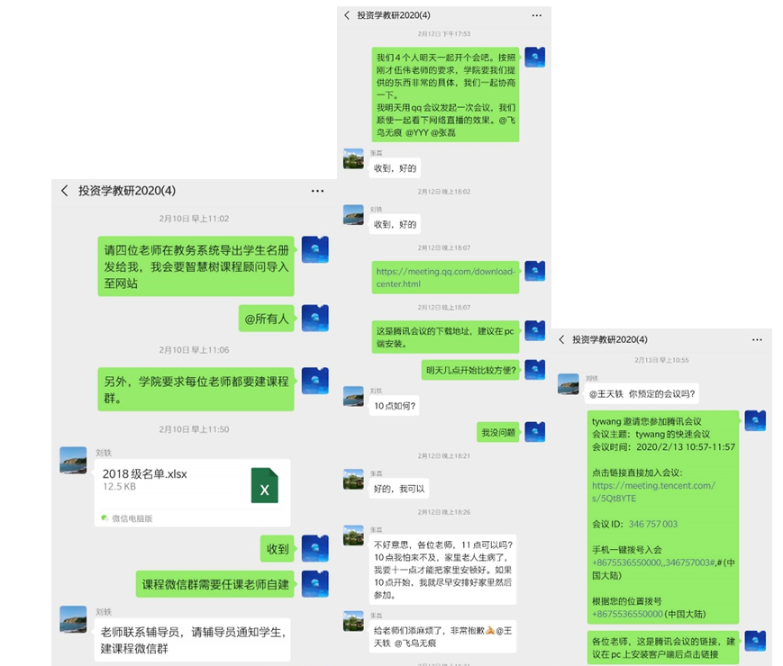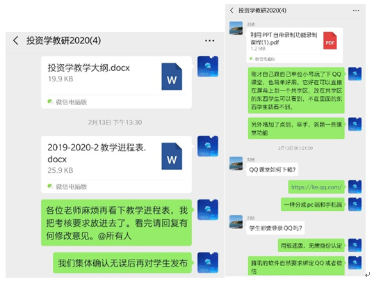 投资学教学团队在收到学院关于新学期教学安排的通知后,第一时间通过微信群通知了团队成员建立课程微信群。王天轶老师于2月13日在教学团队内发起了腾讯会议,研讨新形势下的在线教学方案。当时,张磊老师恰逢家中老人生病,在需要兼顾家里老人、孩子的情况下克服重重困难,参加团队的在线会议,积极参与研讨,其兢兢业业、一心为学生的精神令所有人感动。