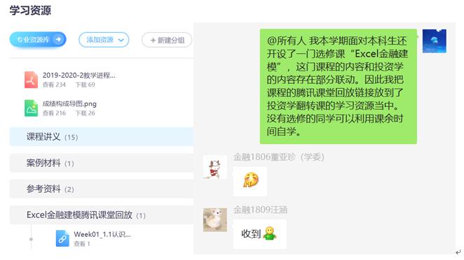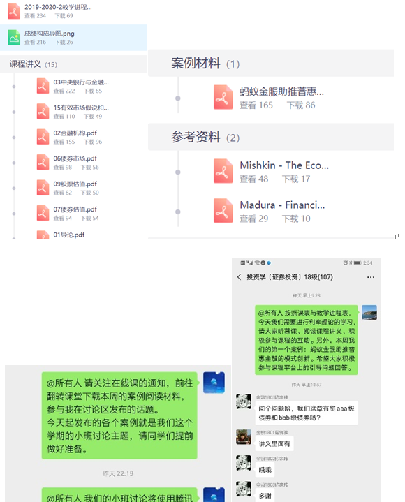 投资学教学团队通过布置详细的学习任务、及时提供学习资源(随学习进度不断补充)、在线互动问答的形式,为学生打造了全天候的在线学习平台。