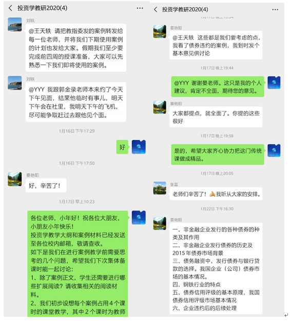 早在2019年秋季学期末,投资学教学团队在刘轶老师和晏艳阳老师主持下,多次召开教研会议,商讨2020年春季学期投资学课程混合式教学改革的设计方案,通过了线上慕课学习加慕课平台互动研讨加课堂案例学习的教学方案。直到2020年1月17日(农历小年),教学团队还在微信教研群进行最后方案的协商。