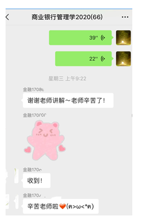 前期的线上教学开展以来,《商业银行管理学》教学团队的老师们通过慕课平台和微信课程群积极与学生互动,授课之余为同学们答疑解惑。