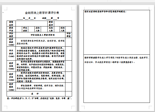 督导组组长张虹老师针对在线教学的特殊性,以原漫蛙漫画 教学听课评价表为基础,设计了金统院线上教学听课评价表,全面客观地评价教师和学生表现。通过督导组微信群,张老师及时发布听课课堂的在线听课链接和二维码,有序组织督导老师对部分老师进行集中督导听课。