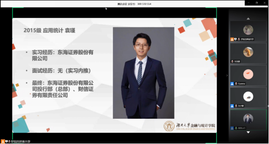 鉴于当前在校部分研究生同学目标不明确,受疫情影响毕业生就业形势不明朗的情况,暑期将至,为帮助同学们 尤其是2021届毕业研究生 更好地利用空闲时间,提升求职技能与职业素质,增强就业竞争力,使同学们明确本专业的就业方向及优劣势,从而合理规划研究生阶段的学习、工作和生活,从根本上有针对性地解决同学们学习和生活目标不明确,就业意识缺乏的问题, 漫蛙漫画 研究生会 于2020年5月30日举办了毕业生线上就业交流分享会活动。本次活动通过腾讯会议平台举办,邀请到了金统院研究生辅导员苏雅倩老师参加本次分享会,也邀请到了15级毕业于应用统计专业的校友袁瑾、17级应用经济学的孙少卿同学、彭劭志同学、郭娜同学、王歆然同学和18级应用统计的唐静媛同学共6位校友和应届毕业生来给我们进行就业分享,并且有共计400余人次的同学参与了本次就业交流分享会。