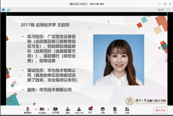 首先进行经验分享的是将要入职华为财经的王歆然同学,她用幽默的语言和结合实际的方法为我们分享了侧重于企业方向尤其是华为公司的一些经验。整个分享主要包括以下几个方面:如何对自己和就业目标有一个清晰的认识、个人的求职经历回顾、简历与面试技巧分享、个人的一些其他建议这几个部分。