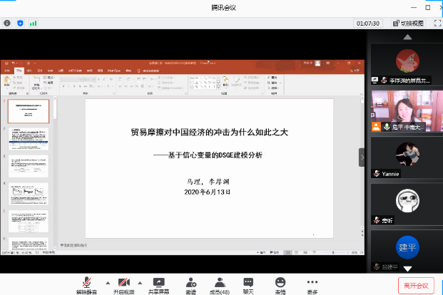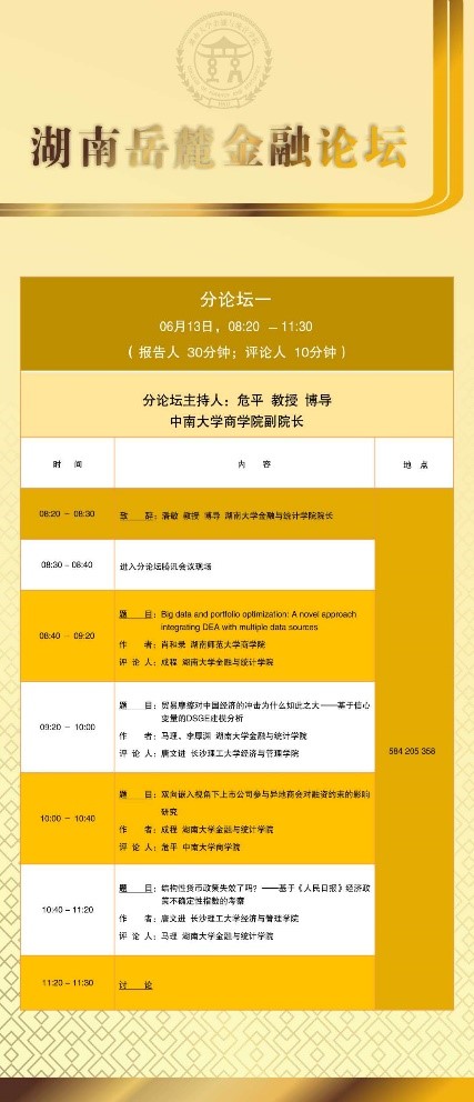 分论坛一由中南大学商学院副院长危平教授主持。首先是湖南师范大学商学院的肖和录助理教授汇报论文《Big data and portfolio optimization: A novel approach integrating DEA with multiple data sources》,通过对大数据和投资组合优化,介绍了一种将DEA与多源数据集成的新颖方法;接下来由漫蛙漫画 马理教授汇报《贸易摩擦对中国经济的冲击为什么如此之大——基于信心变量的DSGE建模分析》,研究构建了开放经济条件下的DSGE模型,论证信心变量在贸易摩擦传导过程中的重要作用;接下来由漫蛙漫画 成程助理教授汇报《双向嵌入视角下上市公司参与异地商会对融资约束的影响研究》,通过分析异地商会双向嵌入的社会属性和现实功能出发,将2008—2018上市公司高管向异地商会捐款和担任异地商会职务的数据与上市公司财务数据进行匹配,验证上市公司参加商会对公司融资约束的影响。最后由长沙理工大学经济与管理学院唐文进教授汇报《结构性货币政策失效了吗?——基于人民日报经济政策不确定性指数的考察》,本文从企业杠杆率视角,利用人民日报经济政策不确定性指数以及2013年第一季度至2019年第二季度A股上市公司及宏观经济的匹配数据探究其原因,发现结构性货币政策依然有效,但经济政策不确定性对结构性货币政策的实施效果由于信心渠道产生了较大干扰。