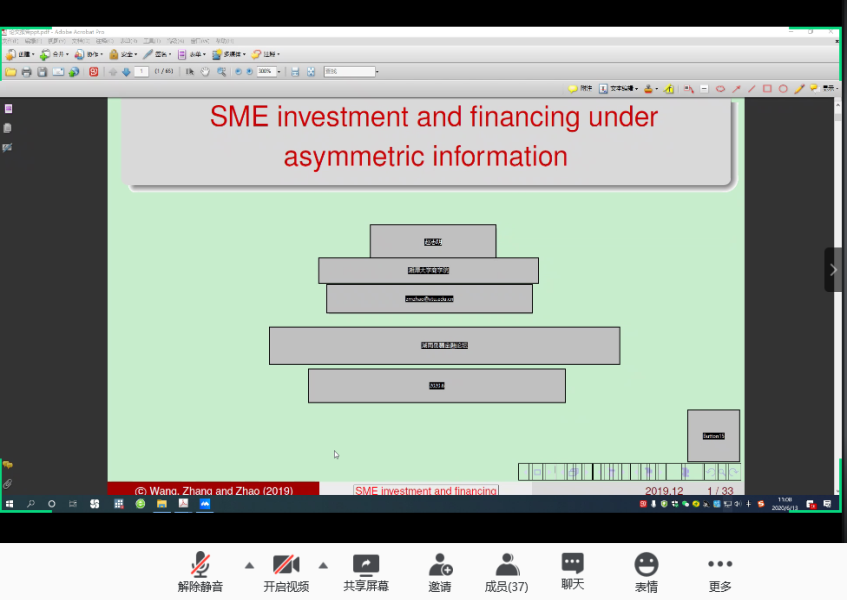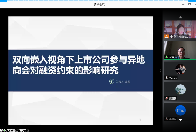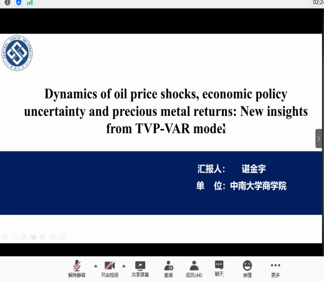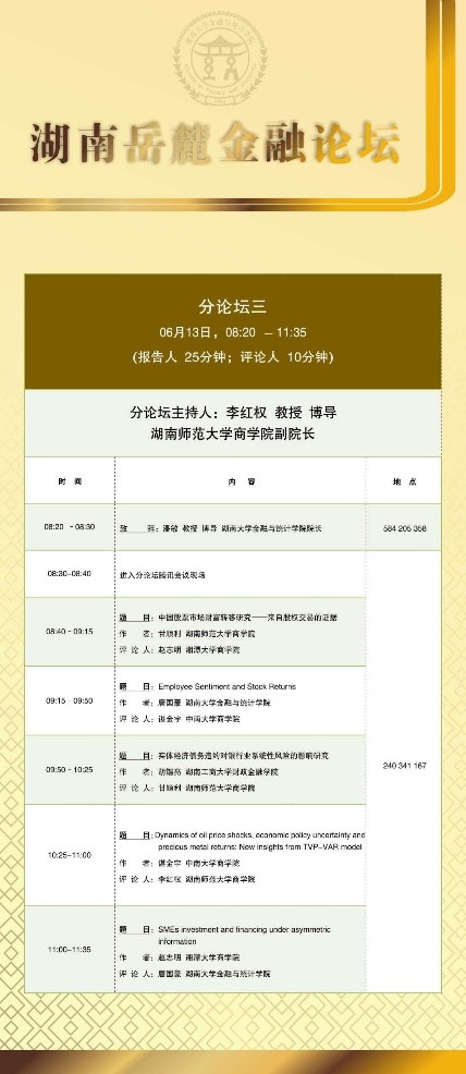 分论坛三由湖南师范大学商学院副院长李红权教授主持,首先由湖南师范大学商学院甘顺利助理教授汇报《中国股票市场财富转移研究——来自股权交易的证据》,本文以2007年第1季度至2019年第4季度中国上市公司股权交易为研究对象,估算了资金空转的收益,并考察了资金空转收益的决定因素;接下来由漫蛙漫画 唐国豪助理教授汇报《Employee Sentiment and Stock Returns》,文章提出了员工情绪指数,作为投资者情绪与经理人情绪的补充,并在样本内和样本外发现了高员工情绪指数能够负向预测未来股票收益;接着湖南工商大学财政金融学院胡锡亮助理教授汇报《实体经济债务违约对银行业系统性风险的影响研究》,本文基于Merton(1974)的标准CCA方法,分析了实体经济债务违约对银行业系统性风险的非线性激增机制,明晰了Nagel & Purnanandam(2020)修正CCA方法嵌入的银行股权与负债“期权的期权”与银行资产收益非线性特征;接下来由中南大学商学院谌金宇副教授汇报《Dynamics of oil price shocks, economic policy uncertainty and precious metal returns: New insights from TVP-VAR model》,基于时变参数矢量自回归(TVP-VAR)模型,研究使用1990年4月至2018年4月的月度数据,着重分析了油价冲击和经济政策不确定性对贵金属收益的动态影响;最后由湘潭大学商学院赵志明助理教授汇报《SMEs investment and financing under asymmetric information》,研究在信息不对称的动态环境中受财务约束的中小企业的投资时机和融资决策。