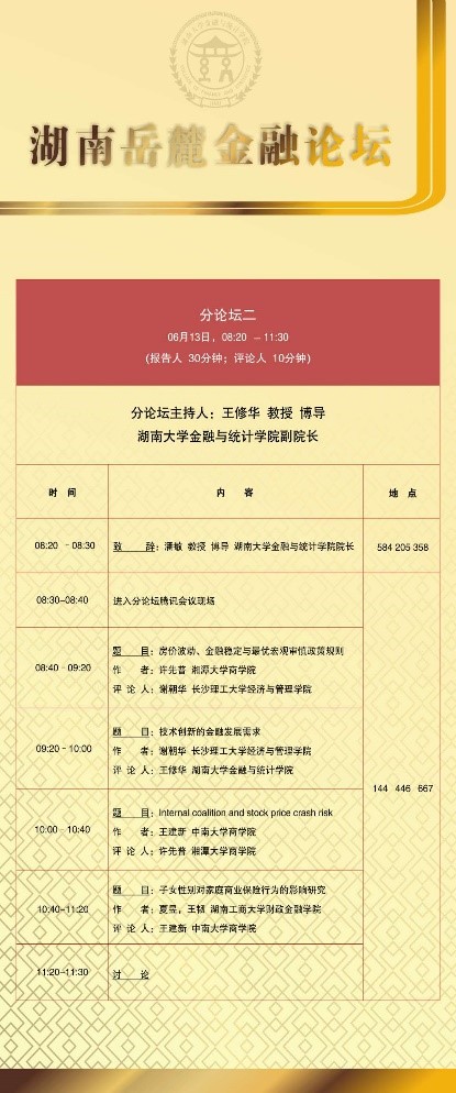 分论坛二由漫蛙漫画 副院长王修华教授主持。首先由长沙理工大学经济与管理学院谢朝华副教授汇报《技术创新的金融发展需求》,认为金融业在结构、功能、效率和安全等四个方面还有较大的发展空间和较强的紧迫性,金融服务技术创新需要练好四大基本功;接下来由湘潭大学商学院许先普副教授汇报《房价波动、金融稳定与最优宏观审慎政策规则》,研究基于植入金融因素的房价波动DSGE模型,分析了不同宏观审慎工具对房价波动的调控效果、作用机制以及最优政策组合等问题;接着由中南大学商学院的王建新副教授汇报论文《Internal coalition and stock price crash risk》,文章检验了内部结盟对2000至2014年间股票崩溃风险的影响,基于任命的内部结盟对股票崩溃风险有正向和重大影响;最后由湖南工商大学财政金融学院王韧教授汇报论文《子女性别对家庭商业保险行为的影响研究》,本文运用Probit和Tobit回归的方法,利用2013年、2015年及2017年三年中国家庭金融调查截面数据研究了家庭对于商业保险投资在一定程度上存在对子女的性别偏好的问题。