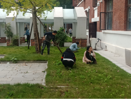 在进行简单的任务分配之后,两支部党员同志们相互配合、积极清扫垃圾,教职工党员们更是充分发挥不怕脏、不怕累的优良作风,争先恐后地动手拔除杂草。历经一个多小时的辛勤劳动,草坪中的枯叶、空调外机附近的卫生死角被清理的干干净净,红楼庭院焕然一新。