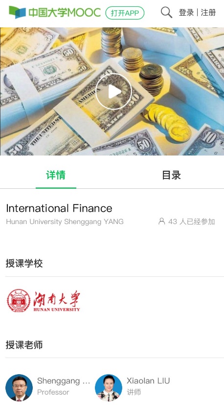 经过历时七个多月的精心打磨,11月23日,《国际金融》国际版慕课在爱课程网的中国大学MOOC国际平台正式上线(课程链接://www.icourse163.org/course/HNU1-1461325174),完成了该课程受众从校园走向校外,并迈向国际的三部曲建设目标。