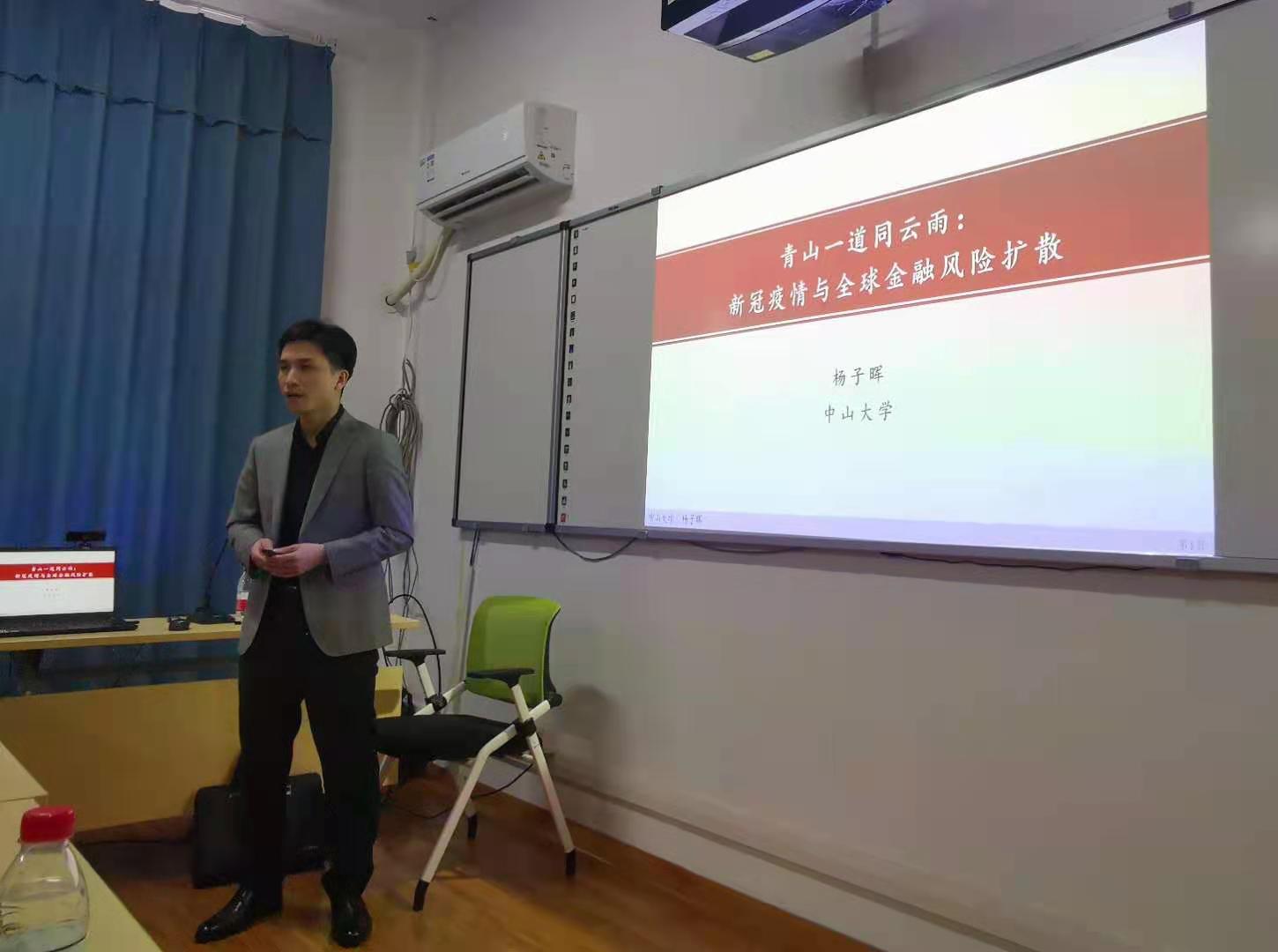 2021年3月26日下午,中山大学岭南学院杨子晖教授应邀来访漫蛙漫画 ,并做题为“青山一道同云雨:新冠疫情与全球金融风险扩散”的学术讲座。讲座由漫蛙漫画 马理教授主持,喻旭兰教授、梁巨方副教授、明雷副教授、赵静助理教授、赵丽娟助理教授、岳崴助理教授,以及部分博士生和硕士生参加了此次讲座,现场座无虚席,讲座受到了同学们的热烈关注与积极响应。