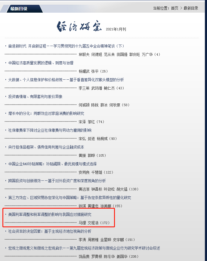 在《经济研究》的“美国利率调整和税率调整的影响与我国应对措施研究”中(马理教授是第一作者,第二作者文程浩是马理教授指导的硕士研究生),构建了两国的动态随机一般均衡(DSGE)模型,在开放经济背景下研究了美国的利率调整(以加息为替代)与税率调整(以减税为替代)对中国经济的影响。结论显示:美国加息会对中国经济产生较大的负面冲击,在短期内会导致中国的产出、资本投入、净出口与就业率出现下降,在长期中虽然下降趋势有所缓和,但对资本外流与净出口的负面影响非常大;美国减税在短期内对中国经济有负向冲击,但在长期中影响较弱。相应的政策建议是:认真评估美国利率调整的冲击方向、力度和影响,关注国内的通胀水平与进出口,向市场灵活适度的定向提供流动性,增加产出与提高就业率;加强监控,采取必要措施防止资本外逃与净出口下降;减税降费降低企业经营成本,推进经济结构调整;预估可能产生的贸易摩擦与政治矛盾,提前做好防范预案。