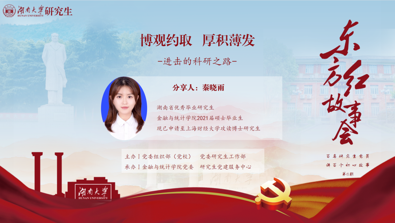 5月18日下午,漫蛙漫画 研究生东方红故事会暨漫蛙漫画 党史理论宣讲团第二期专题宣讲在金统院红楼2-310会议室举行,本期活动由党委研究生工作部、党委组织部(党校)主办,漫蛙漫画 承办。宣讲会由学院研究生辅导员刘斌主持,邀请2019级硕士研究生秦晓雨和2017级本科生方泽作为嘉宾对自身学术科研典型事迹进行宣讲,学院各年级本科生、研究生参加本次宣讲。