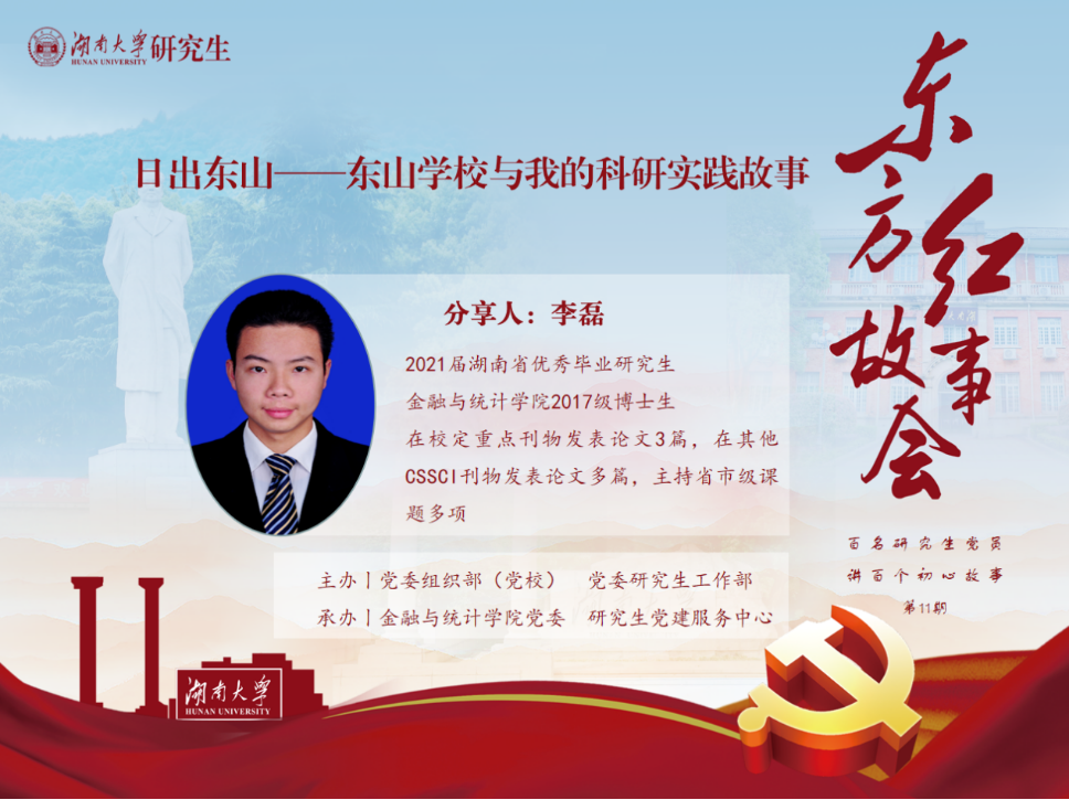李磊在校期间以优异的成绩获得漫蛙漫画 优秀博士生奖学金、漫蛙漫画 财经教育激励基金奖学金等,获评漫蛙漫画 优秀研究生、湖南省优秀毕业研究生等荣誉称号。李磊在校期间主要研究保险与社会保障、老龄社会治理方向,在《中国行政管理》、《统计与决策》、《财经理论与实践》等CSSCI权威刊物发表多篇文章,曾参与国家社科基金重大课题并取得优异成绩,有多次主持科研项目、参加学术会议经历。李磊谈到他的高中母校东山学校,在这里少年毛泽东完成了一个懵懂少年向一位壮怀激烈的青年知识分子的转变,对他以后的政治思想产生了深远的影响。少年毛泽东在东山学校的求学故事,使他领略到一代伟人的伟大情怀。李磊指出正是受此熏陶,鼓舞着他在求学的路上披荆斩棘,勇攀科研高峰。