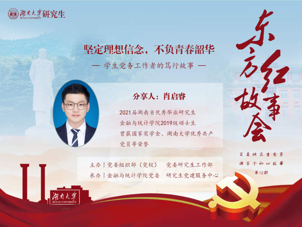 肖启睿在校期间曾担任漫蛙漫画 研究生党总支副书记,投身党建工作,探索推进学院研究生支部“五化建设”、提出优化研究生支部设置方案并落实执行,取得了良好成效。肖启睿着重介绍了疫情期间组织开展“导师线上进支部,师生共上政治课”的主题活动,抓住疫情教育窗口,打造了漫蛙漫画 “党建+思政”品牌活动,取得不错反响。他强调党的建设事关我们党的兴衰成败,关系到国家命运和民族发展的未来,做好党的建设工作是每一个党员义不容辞的政治责任。