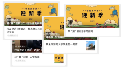 依托读研在金统微信公众号平台,定期推送生活、学习、入党、报到指南,为新生提供全方位入学导航,以热情饱满的姿态,迎接满“新”欢喜的相遇。