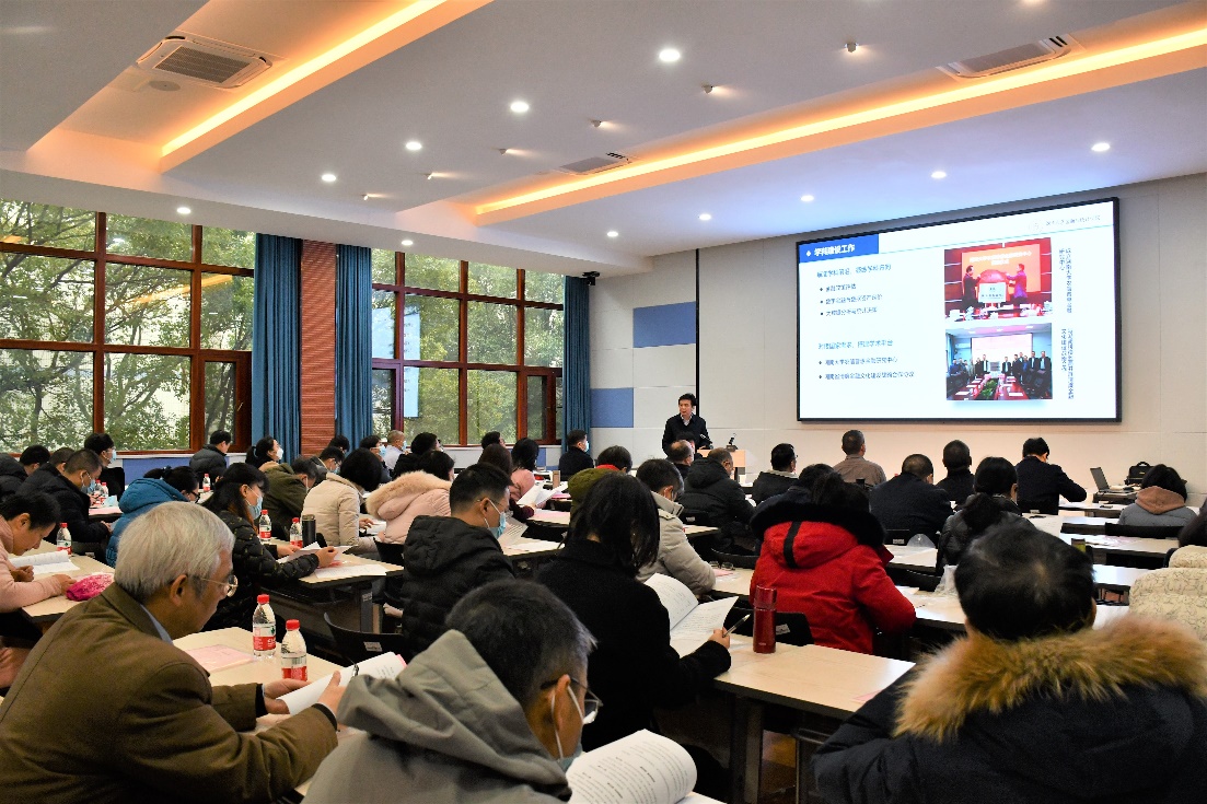 会议第一阶段,院长潘敏作题为“夯实立德树人基础 推进一流研究型学院建设”的工作报告,报告从学科建设、人才培养、科学研究、队伍建设、国际交流、党建思政六个方面总结了2021年的工作举措与成效,并对2022年工作进行安排部署。潘院长指出:2022年,学院要以习近平新时代中国特色社会主义思想为指导,紧扣学校“双一流”建设和“十四五”发展目标,以立德树人为根本,以人才培养为中心,以队伍建设为抓手,以科学研究为指引,以内涵建设提升学院综合实力,以特色发展强化学院核心竞争力,以创新发展激发学院办学活力,以开放发展提高学院国际影响力,以和谐发展增强学院发展凝聚力,为创建国内领先、国际知名的高水平研究型学院奠定基础。