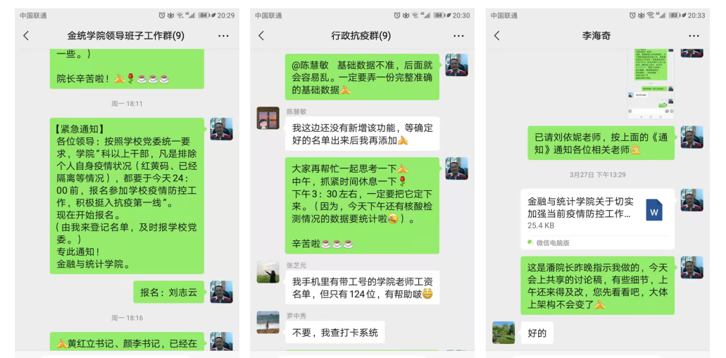 事发突然,情况紧急,容不得半点疏忽和延误。危急关头,学院综合管理办公室主任刘志云同志、疫情防控信息专干罗中秀同志,受命学院党委指示,立即毫不犹豫地肩负起了“24小时联络人”的使命。时间紧迫,人员分散,要有效地落实学院2500余名师生的信息掌控、协作联动和动态管理工作,这无疑是一副沉甸甸的担子!