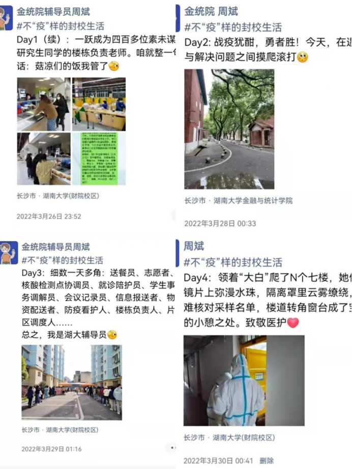3月26日下午,一通调令让周斌在负责自己所带的五百余名硕士生、博士生之余,还充当起了“栋长”的角色:“周老师,望麓桥3栋学生公寓是南校区各学院研究生,学生情况复杂,缺少楼栋负责老师,你可以去吗?”“我可以!”没有犹豫,也没有迟疑。这栋公寓楼里住着来自两个校区11个学院的研究生,为了尽快“摸清底牌”,做到心中有数,他迅速组建起由25名研究生骨干组成的管理团队,以志愿活动的形式带领学生去食堂领餐、取餐、配餐。除了保障学生饮食,他还要负责望麓桥园区的核酸检测、数据统计及报送、志愿者招募及管理等工作。每天忙完就已经是凌晨,但他始终坚持在睡前的零碎时间用微信朋友圈分享自己的抗疫故事,传递抗疫正能量。