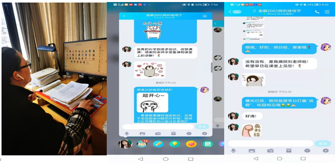 刘晓兰老师积极参加了教务处组织的“疫情重启的线上课堂教学技巧”工作坊的培训学习,精心选择了雨课堂直播+腾讯会议的在线授课模式,通过雨课堂随机点名答题、做小测试题、开放弹幕,腾讯会议学生实时答题和聊天的方式,及时把握学生的课堂动态,在课后在QQ群及课程讨论区为学生及时答疑解惑,并适时鼓励学生,坚定打赢“战疫”的信心,携手迎接校园暖春。
