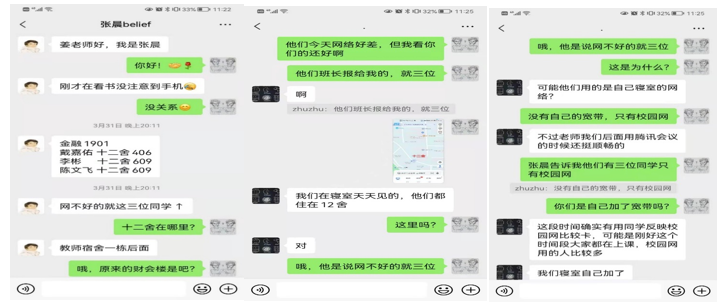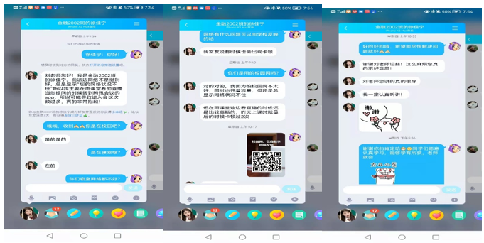 刘晓兰老师在线授课当天查看学生上课详情时,发现一位同学反复加入腾讯会议达14次,马上在QQ群里加该同学好友,了解到是因为该同学的寝室网络状况不佳,让她们寝室的同学都填写了校园网、在线教学问题反馈表,同时也向院教务办的李晖老师反映情况,问题得到了及时解决。学生感受到老师真挚的关心和帮助,相信之后的课程学习必然不会再“掉线”。