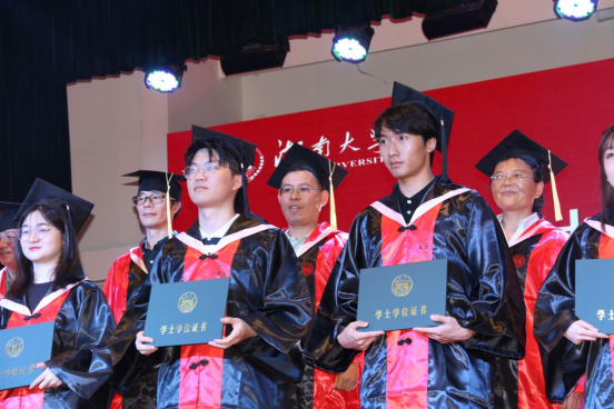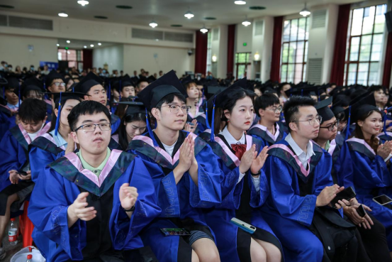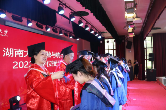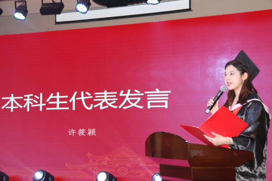 毕业生代表、2018级博士研究生徐照宜讲述了在湖大十年求学的成长故事和人生感悟,他表示是湖大让自己勇敢地尝试无限可能,湖大不仅仅只是研究学问的学术殿堂,更是“实事求是”的精神图腾;财院校区也不只是享受青春的大学校园,更是“经世致用”的文化象征。他祝福每位毕业生将自身发展同国家富强、民族复兴紧密结合,愿二十年后能用更响亮的声音向母校汇报,交出金统人无愧于国家和时代的答卷。