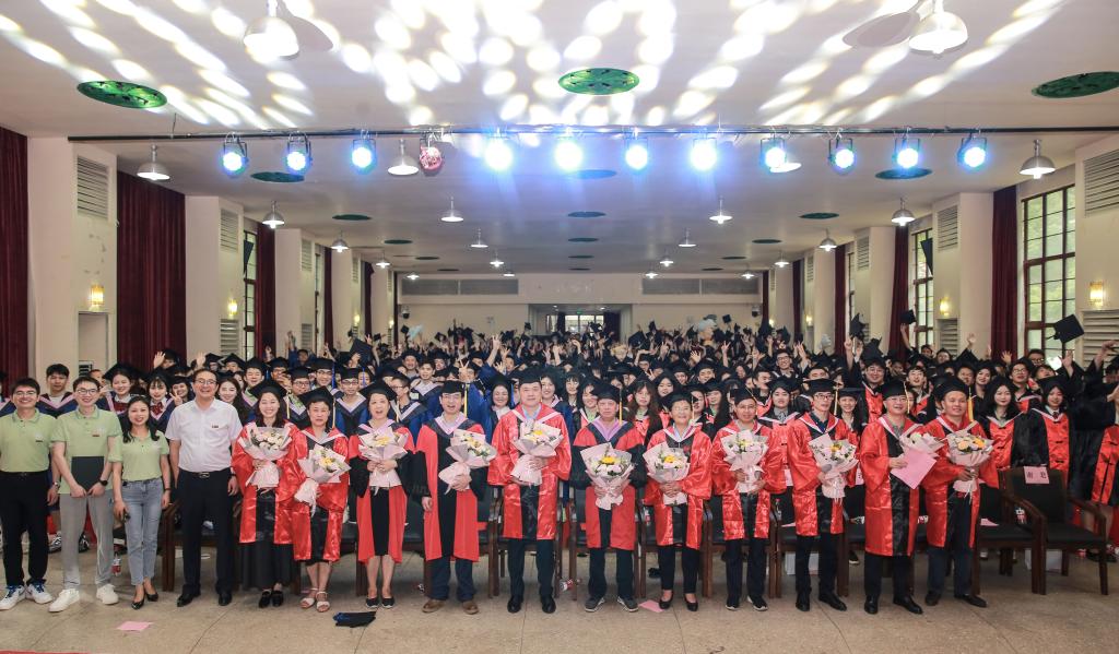 院学位评定分委员会成员、教师代表为毕业生颁发学位证书并拨正流苏,毕业生依次上台领取学位证书,留下珍贵的合影。随后,毕业生代表向老师们献花,感谢师恩。